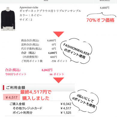 アルページュ系はどれも高いな〜なんて思っていたけれど、MAXの70%オフだと月に3〜4着買っても2万円前後。意外と手が届く気がしませんか♪